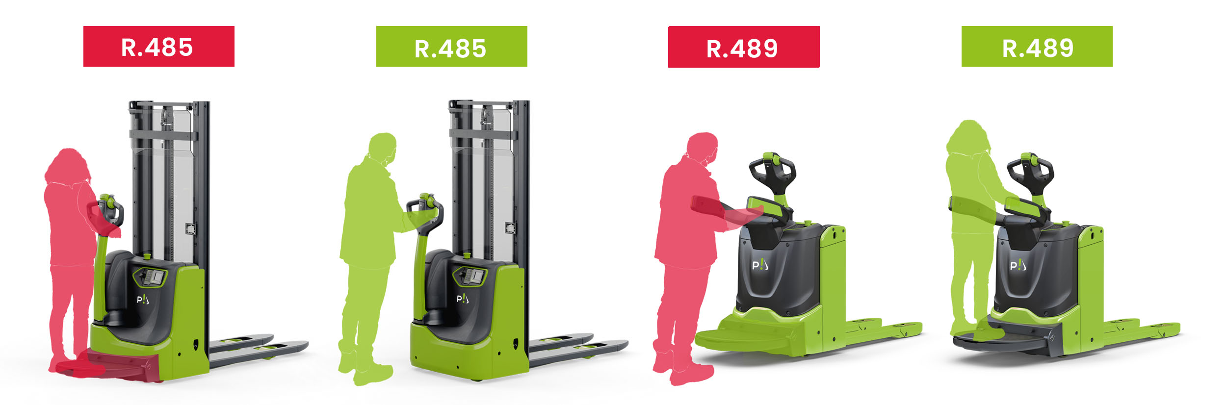 La R.485 s’applique aux appareils où l’opérateur marche à côté du chariot. À l’inverse, la R.489 concerne les chariots où l’opérateur est porté sur un poste fixe, ce qui augmente la vitesse, l’inertie et les risques en hauteur. Elle inclut donc les gerbeurs à poste de conduite, mais aussi les chariots frontaux, rétractables ou préparateurs de commande.